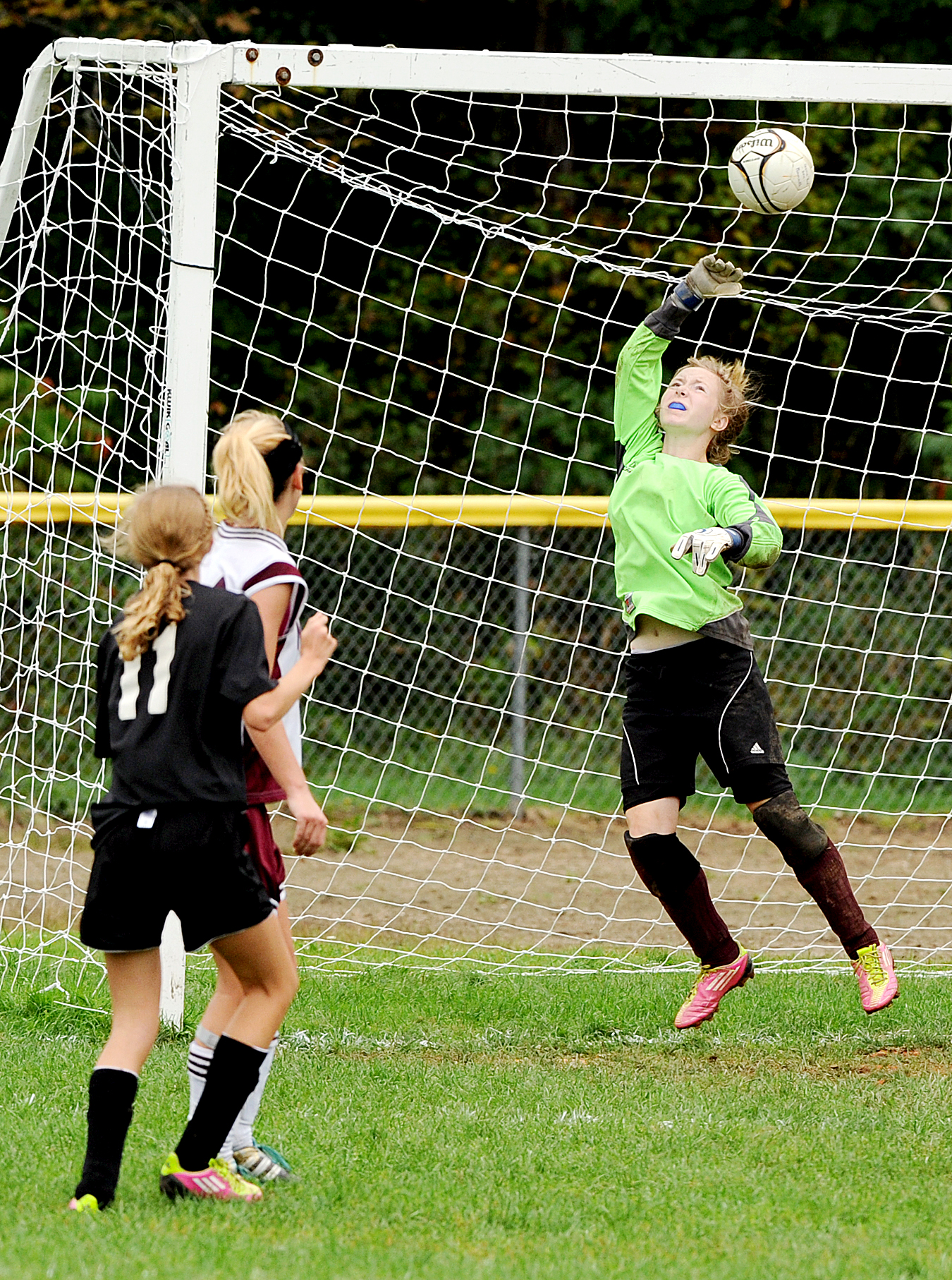 A shot on goal by Paige Galligan (11) of Lisbon High School gets past Monmouth Academy goalkeeper Natalie Young during the first half in Monmouth on Saturday. Galligan’s goal put the Mustangs up 3-0.