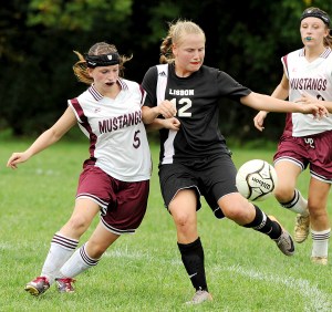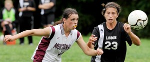 Ashley Coulombe, left, of Monmouth Academy and Brooke Lawrence of Lisbon High School compete for the ball during the first half in Monmouth on Saturday.