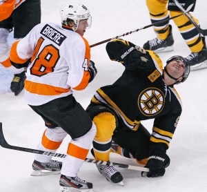 Claude Giroux and Jakub Voracek scored 47 seconds apart in the final minute of the first period for the Flyers, who overhauled their roster after being swept out of the playoffs by Boston in the second round. The Bruins went on to win their first Stanley Cup title since 1972.
