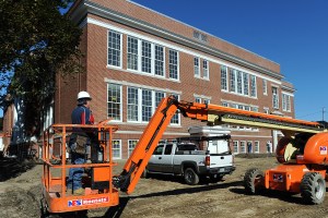 Roger Plourde of Lewiston, who works for Veterans Construction, drives a lift around the former Webster School on Hampshire Street in Auburn on Thursday morning. He was with a crew hired to replace dozens of windows in the former school that is on the National Register of Historic Places. It is being converted to 28 mixed-use apartments, including 10 that are handicapped accessible. The project is scheduled to be completed by the end of the year.