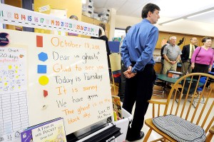 Lewiston School Committee Chairman Jim Handy tries out the reading cushions in the pre-kindergarten classroom while reading “Gus Goes to School” during a tour of McMahon Elementary School on Monday. School committee members were given a first-hand look at the school expansion during a tour lead by Principal Tom Hood and Assistant Principal Cindy Gish. The $2.75 million expansion created three new kindergarten classrooms, two new pre-K classrooms, an art classroom, a music classroom and an expanded library with computers and a reading nook. The school department now hopes to build a new gymnasium and a classroom wing, which would cost $5.6 million, in the next two years, to address a growing number of students in Lewiston.