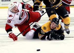 NOTES: Carolina D Tomas Kaberle, a midseason pickup by Boston last season before he signed a three-year, $12.75 million contract with the Hurricanes, got his Stanley Cup ring from Bruins GM Peter Chiarelli in the morning. … Bruins D Joe Corvo left the bench after taking a hard hit into the boards, but he returned in the second period. … It was Boston’s first of four straight home games. … The Bruins’ three previous losses were by one goal. … Boston C David Krejci missed his third straight game with an undisclosed injury. … Brett Sutter, who played most of last season with Charlotte of the AHL after being acquired from Calgary in November assisted on Stewart’s goal for his first career point. … Boston has four goals total in its losses.