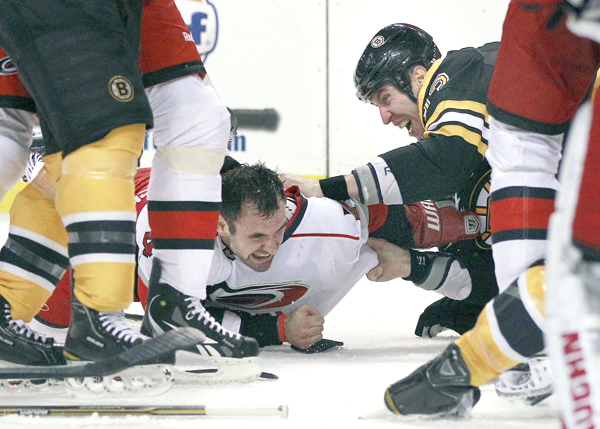 Boston’s frustration showed during a scrum behind the Hurricanes’ net late in the second. Chara and Bruins wing Milan Lucic both charged into a group of players, and Chara ended up squaring off with defenseman Jay Harrison. During the melee, Rask skated to the other end and went mask-to-mask with Ward, but neither threw a punch.