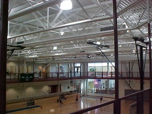 It sports an eight-lane, competitive swimming pool, a warmer therapy pool, an indoor track, racquetball courts and other amenities.