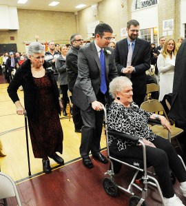 In the procession to the stage, LaBonte escorted his grandmothers. Mary Charpentier walked beside him with a cane, as he pushed Yolande LaBonte in a wheelchair. Yolande lives at d’Youville Pavilion in Lewiston. Charpentier resides at Clover Assisted Living in Auburn.