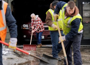 Vernon Daigle, background, pitches in as crews from the Lewiston Water Department clear Daigle’s driveway on Pleasant Street in Lewiston on Tuesday. Daigle’s driveway and yard were flooded when an eight-inch water main broke at 11:45 p.m. Monday at Pleasant and Valley streets. Fifteen feet of pipe blew out as ice prevented the water from being turned off. “Valves, gate boxes were frozen. Everything was frozen,” said a water department employee. “What a mess,” said Daigle, who had some water in his basement and rocks all over his front yard. The rushing water pushed Daigle’s neighbor’s trash 200 feet down the street, said Daigle, who lives at 352 Pleasant. “I didn’t know anything about it until I woke up this morning at 8 a.m.”