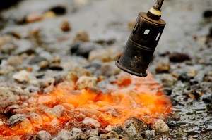 Tom Freitas of the Lewiston Water Department uses a torch to free up frozen rocks from Vernon Daigle’s driveway on Pleasant Street on Tuesday morning. The rocks washed into Daigle’s driveway and yard when a water main broke at Pleasant and Valley streets late Monday night. Yards were flooded along Pleasant and Heathwood Lane all the way south to Hillmount Drive.