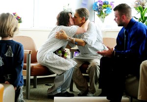 LEWISTON — Pam LaFreniere placed a hand on Barry Hanson’s cheek, knelt and whispered to her husband-to-be, then watched as he rolled down an aisle at Central Maine Medical Center.