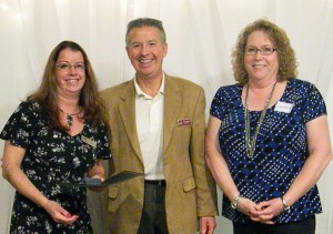 Dawn Jesseman, left, a teller at Maine Family Federal Credit Union, was honored recently by the staff and board of directors for his one year of service to the credit union. Ronald Bissonnette, center, chairman of the board, and Rachel Caron, CEO, offered congratulations to Jesseman and others who were honored at the ceremony. Maine Family FCU has offices at 555 Sabattus St., Lewiston, and 831 Minot Ave., Auburn.