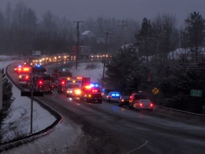 Police moved traffic on to Route 133 in front of Franklin Memorial Hospital after the mishap and while fire, police and rescue crews responded to the crash. A line of traffic traveling west remained in place as emergency crews and police worked at the scene and dusk began to fall.