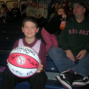 John Hatcher of Harrison won the Maine Red Claws basketball autographed by all the players at a recent Red Claws game. He went to the game on Jan. 22 with a bus full of kids, parents, Harrison youth basketball coaches and friends who traveled to the Portland Expo to watch the Maine Red Claws take on the Erie Bay Hawks. The group participated in the opening ceremonies by holding a giant American flag. The event was sponsored by the Harrison Recreation Department.