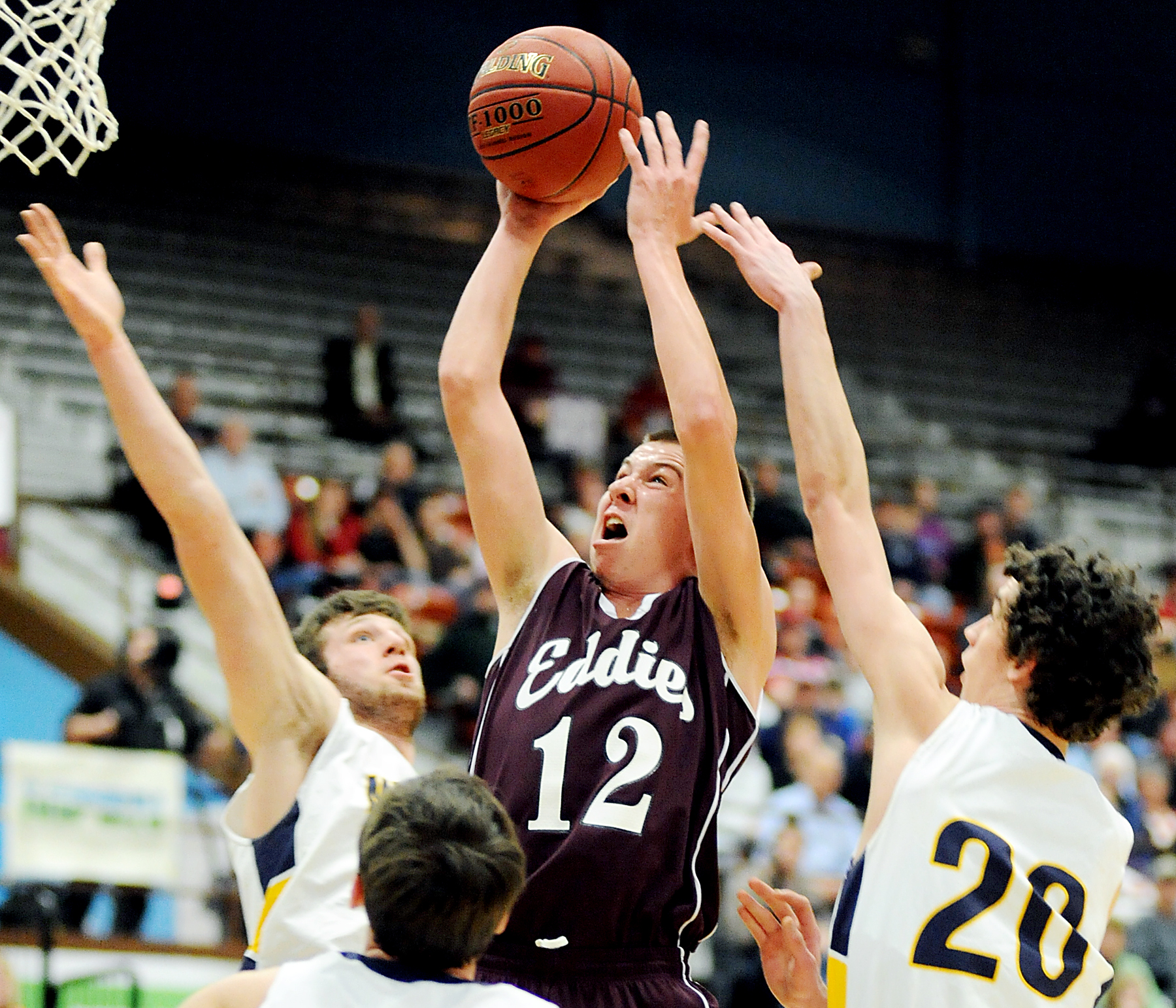 EL needed a miracle and seemed to get it when Hart’s subsequent inbounds pass went off Yardley’s leg in front of the Eddies’ bench with 4.8 left. Leary front rimmed the 3 to tie it and Mt. Blue’s Nick Hilton rebounded, but he lost his balance and was whistled for traveling, giving the Eddies one last desperate attempt with 0.3 of a second still on the clock.