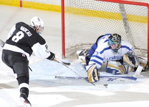 As for Holtet, his goal seemingly came out of nowhere. With the Blue Devils enjoying a power play — the tail end of a 5-on-3 that had turned to a 5-on-4 — Holtet scared up a turnover at the Lewiston blue line as the Devils’ defenders tried to lug the puck out of the zone. Holtet swiped the puck and bore down on Lewiston keeper Brian Wigant. He juked to the right, pulled the puck back to his left on his backhand and flipped the puck toward the cage. Seemingly with eyes, the puck snuck through Wigant and into the net behind him.
