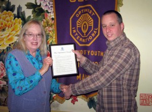 Guest speaker Gretchen Rosen of the Lewiston-Auburn Children’s Foundation is pictured receiving her copy of the Optimist Creed from club president Chris Bilodeau. The foundation also donated $200 to the club, which is scheduled to be used to purchase new bike helmets for needy kids. The L-A Optimist Club meets for lunch at Chopsticks Restaurant in Lewiston on the first and third Tuesday of each month.