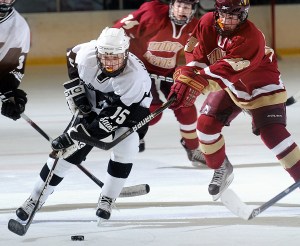 Depth aside, the night — at least the first period — belonged to the Trojans’ top scorer. Maksut started thing off with a finish on a fortunate bounce as Andrew Carignan tried to pass the puck to the point. The puck hit a St. Dom’s defender and landed on Maksut’s stick, and the senior buried his chance for a 1-0 advantage just 2:02 into the contest.