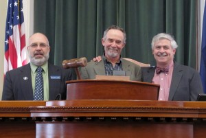 State Rep. Russell Black, R-Wilton, and State Sen. Thomas Saviello, R-Franklin, stand at the State House speaker’s rostrum with Milt Baston of Strong on March 22. Baston, a member of the Strong Board of Selectmen, was named the Certified Logging Professional of the Year in the Conventional Category by Maine’s Certified Logging Professional Program. From left are Black, Baston and Saviello.