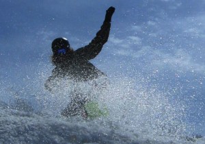 Skiers and snowboard riders tried to “skim” — with varying degrees of success — across the 72 feet of water without getting too wet.