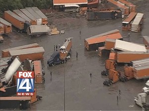 Footage from highway video cameras showed a large, dark funnel cloud moving on the ground not far from a major interstate early Tuesday afternoon. Crumpled orange tractor trailers were later visible in a Dallas County parking lot, as well as flattened trailers along the sides of highways and access roads.