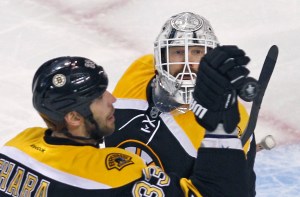 The Capitals took their first lead of the series when Brouwer poked a puck out of the crease and under Thomas, who was blocked by Bruins defenseman Greg Zanon. That ended Thomas’s postseason shutout streak at 161:41 — a span that included shutouts in Game 7 of the Stanley Cup finals and Game 1 of this series.