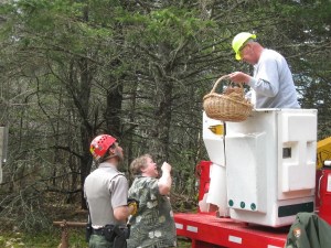 A ranger was hoisted up to the nest site on Sunday in a bucket truck and, after placing the pine-needle-lined basket in the tree, the owl chick was lifted up to the basket in a small blue cooler and then placed by the ranger in the basket.