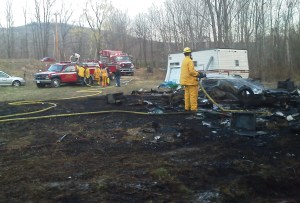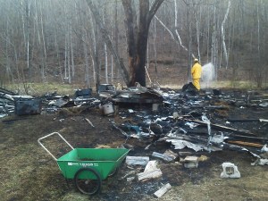 A Strong firefighter douses smoldering debris on Friday evening at 530 Farmington Road in Strong after a 14-foot camper, its contents and a quarter acre of lawn were destroyed by fire, Maine Forest Ranger Mark Rousseau said.