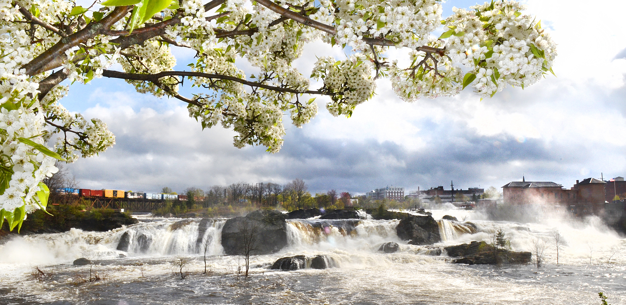 The Androscoggin River roars as it flows over Great Falls between Lewiston and Auburn Tuesday morning as patches of blue sky poke out from the clouds that brought heavy rains over the past few days. Flood warnings along many rivers and streams that are cresting should subside later today. The forecast is for clouds and a slight chance of showers for the next few days.