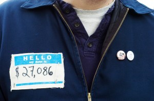 Her personal debt, according to the patch on her chest, is $130,000, the product of a University of Southern Maine education and the debt that has accrued since she graduated.