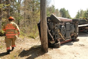 Capt. Laurier Crowell of Poland Fire and Rescue looks over the scene of a rollover on Route 11 near Tripp Lake on Thursday. James Cleveland, 65, of Bridgton escaped serious injury when he steered the Chrysler minivan onto the soft shoulder to avoid a car that crossed the centerline on a curve, Androscoggin County Deputy Eric Samson said. An ambulance crew checked Cleveland at the scene.