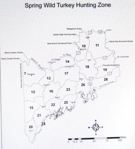 Available hunting zones are Wildlife Management Districts 7, 10-26 and 28, which is essentially Western, Central, Southern and Down East Maine. A map of the zones can be found at www.maine.gov/ifw/hunting_trapping/hunting/wild_turkey_springzone.htm.