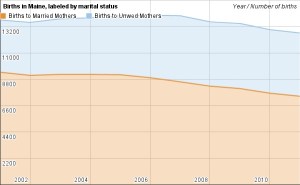 The number of marriages in Maine is down 10 percent over a decade, married births down 21 percent and births to unwed mothers up 21 percent, according to the Department of Health and Human Services’ Data, Research and Vital Statistics office.