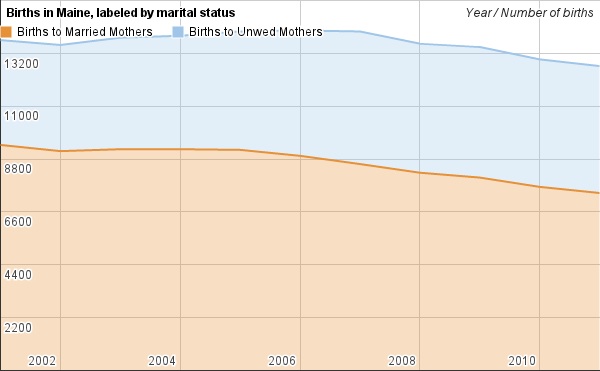 The result is that 40 percent of all children born in Maine last year were born to unwed mothers, up significantly from 10 years ago. What it will mean to the state if the trend continues is not clear; there are few hard numbers on the phenomenon and few people studying the impact.
