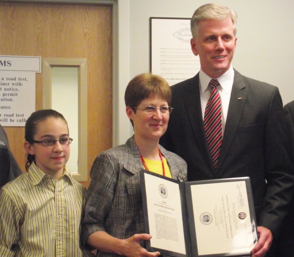 Stephanie Beaulieu was given the Secretary of State’s Commendation Medal by Secretary of State Charlie Summers during a surprise ceremony at the Bureau of Motor Vehicles in Caribou. A number of family members and current and former colleagues attended, watching as Beaulieu’s daughter Sarah pinned the medal to her mother’s jacket.