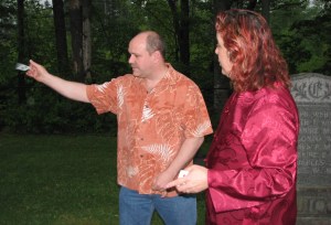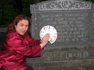 With his hair flamboyantly dyed in red streaks, Jeff McBride deftly performed card flourishes beside Dr. James William Elliott’s family tombstone.