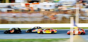 Butch Keene, front, of Turner, Rob Greenleaf, of Minot, Scott Farrington (22) of Minot and Calvin Rose Jr. (8) of Turner fly down the back stretch during the mini stock feature at Oxford Plains Speedway on Saturday. Jimmy Childs of Leeds won the race. Greenleaf took second and rookie George Fortin placed third.