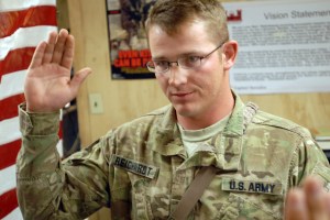 Sgt. Ozzie Reichardt, native of Auburn, Maine, re-enlists in the Army Reserves for another six years while serving with the 668th Engineer Company at Kandahar Airfield, Afghanistan. Reichardt has already served seven years with the reserves.
