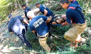 The rescuers, who also included Lewiston firefighters, carried Reckerds through thick underbrush and fallen trees to a waiting ambulance. Despite a possible fractured ankle, he joked with responders.