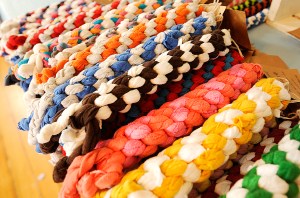 Voynik has taken over his mother’s living room, turning it into a Wag Rags office, with old T-shirts — given to him by friends — piled on one table, finished Wag Rags piled on another and unfinished braids hanging on a ladder, waiting to be woven together.