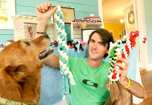 At his mother’s place, golden retriever Syd and Chihuahua Meeko serve as toy testers. At his father’s place, golden retriever Cooper does. Most of Voynik’s promotional photos feature one or more of the family dogs, though customers have started sending him photos of their own pets and Wag Rags.