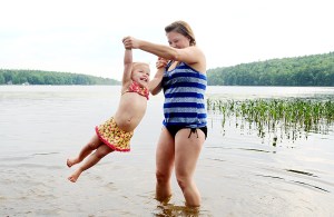 Leanne Bazinet of Lewiston plays with her 2-year-old daughter, Jazmin, at No Name Pond in Lewiston on Monday. Temperatures in the high 80s are expected again on Tuesday.