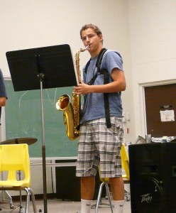 Ethan Pierce of Freeport took a short break from rehearsal, and he was happy to talk about his love of jazz. He has been playing the alto and tenor saxophone for four years and takes weekly lessons from Tim O’Dell, a music professor at the University of Southern Maine. He started music classes in elementary school.