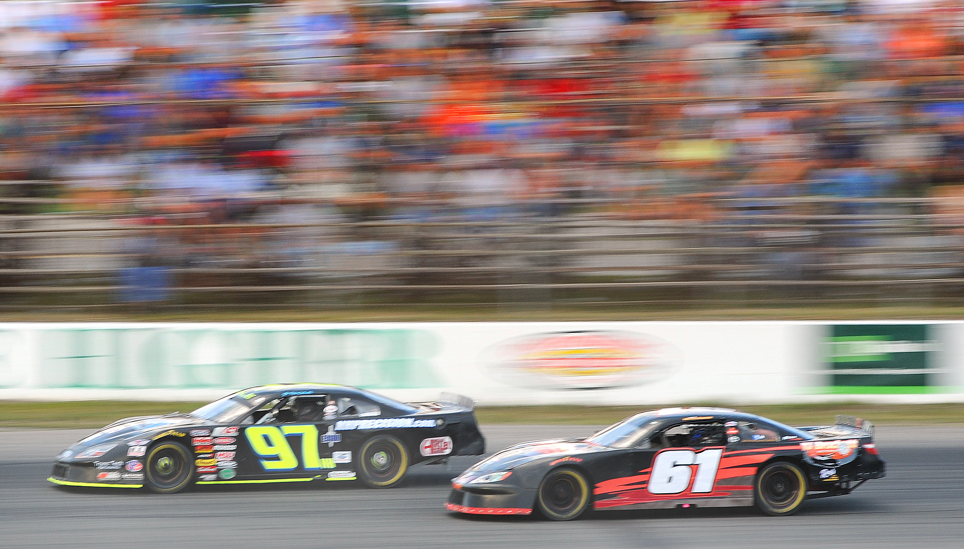 Joey Polewarczyk Jr., and T.J. Brackett,of Buckfield fly past the fans in the back stretch during the middle stages of Sunday night’s TD Bank 250 at Oxford Plains Speedway.
