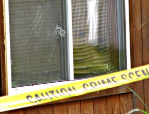 Tundra, a cadaver dog, is also trained to follow human scent. Judd worked the dog around the side of the trailer where a bullet hole could be seen in a side window. James told Judd that the bullet struck the back board of an electricity meter.