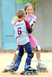 Summer Grant, 9, and her brother Gene, 6, both of Minot, use inline skates at Festival Plaza in Auburn on Friday. “They wanted to go skating and it was a nice day,” said older sister Ecko Grant, 16, who was watching the pair. “They’ve both been skating for about 5 years. When (Gene) started walking, he started skating.”