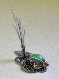 A wide variety of duck-themed art will be put on the block— from settings of ducks in a silvery marsh created by metal artist Rod Blood and painter Pat Thurston, to a quilted duck by fabric artist Martha Goldsmith, to a faux-Egyptian bas-relief carving of a duck “god” by Jonathan Crowe.