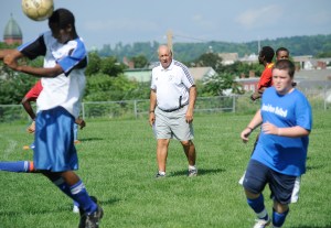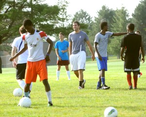 Lewiston High School soccer coach Mike McGraw works with his player on Monday opening day of practice at Marcotte Field.