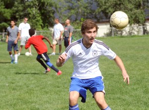 Lukas  Schulze of Lewiston High School heads the ball  on Monday opening day of practice at Marcotte Field. Schulze is from Germany.