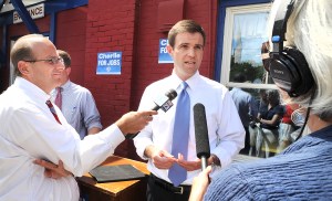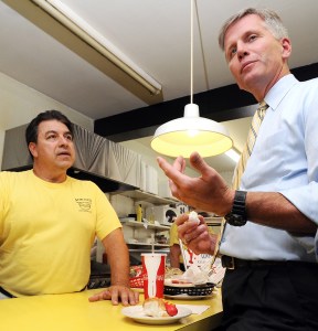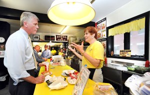 LEWISTON — The top political operative for the U.S. Chamber of Commerce continued to defend television ads that denounce the record of former Maine governor Angus King, an independent U.S. Senate candidate, during a whistle-stop at a Simones’ Hot Dog Stand on Tuesday.