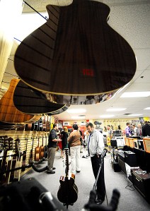 George Dycio, economic development specialist for the Lewiston-Auburn Economic Growth Council, checks out merchandise during the grand opening of Musician’s Hub at 120 Center St. in Auburn on Thursday. Owner Dana Hartwell has been a musician since age 13 and started dreaming of opening his own business while in the U.S. Air Force, according to an email from the council’s Calvin Rinck. The 2,600-square-foot store will offer new and vintage equipment, accessories and lessons.