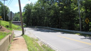 A concrete wall on the curve doesn’t allow room for a sidewalk on one side and a steep gully on the opposite side of the street eliminates the sidewalk, necessitating the diagonal crossing.