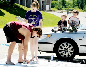 Matt Berube, left, and Phoebe Voisine paint Berube’s parking spot while brothers Heath, 2, second from right, and Patrick Graves, 6, watch from the hood of Berube’s car at Edward Little High School in Auburn on Wednesday. Students hold a longstanding tradition of allowing seniors to claim their special parking spot and decorate it as they wish. Berube, a 17-year-old senior, painted “When you want to succeed as bad as you want to breathe, then you’ll be successful,” a quote he found on YouTube that he and his teammates on the EL lacrosse team use for inspiration. Heath and Patrick Graves of Lewiston were being looked after by Voisine.